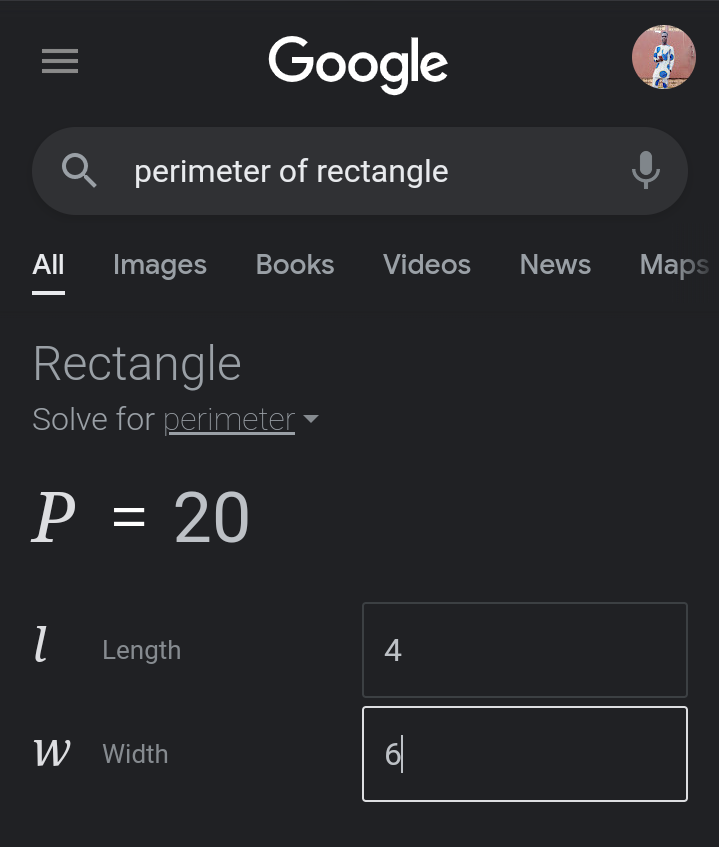 The google search bar can also solve mathematical problems involving shapes (perimeter and area).