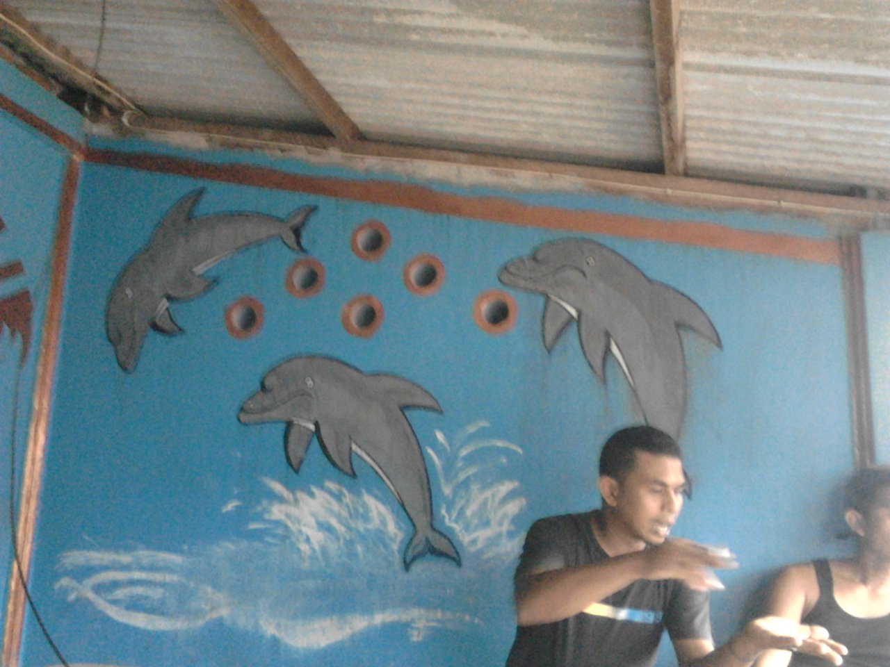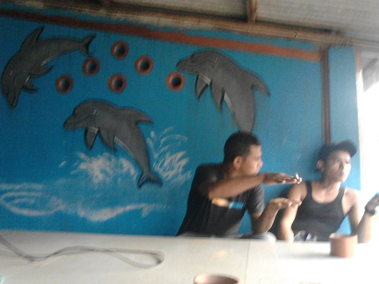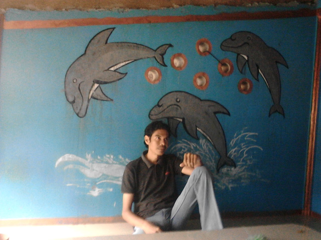 He looks old, because the front of his head is bald, due to his hair falling out all the time, making his head bald. Even though he is only 19 years old. But my friend's way of thinking is very mature, unlike friends his age who are still childish. That's because he often joins us, and we often teach him how to act maturely. The three dolphin paintings behind us are a source of inspiration and motivation for us.