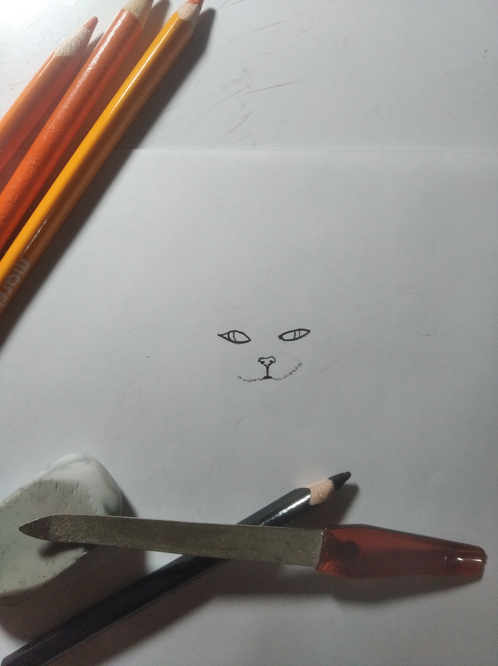 Para la realización de este dibujo utilicé pocos materiales, solo 5 colores, 3 color naranja de distinta tonalidad, 1 color rojo y 1 color negro, además del lápiz de grafito, utilicé un sacapuntas y una lima de uñas para darle esos toques de sombreado a los pelos del gato. Un borrador para delinear el sombreado y un pincel para que el sombreado no manchara el resto del dibujo.