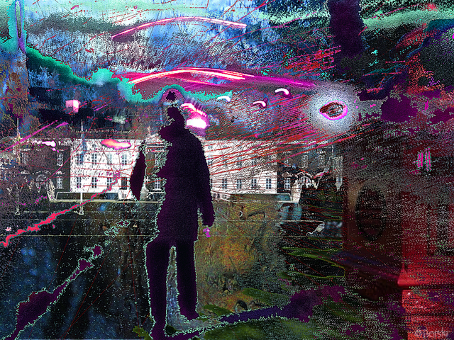 В своих снах я погрузился глубоко в ночь, и волшебство заставило меня взять старинный огнетушитель, который был в углу фотографии. Я наполнил его разноцветными красками и сбросил с высоты, почти с луны.