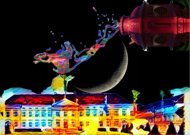 In my dreams I went deep into the night and the magic led me to take the antique fire extinguisher that was in the corner of the picture. I filled it with different colored paints and dropped it from high above almost from the moon.
