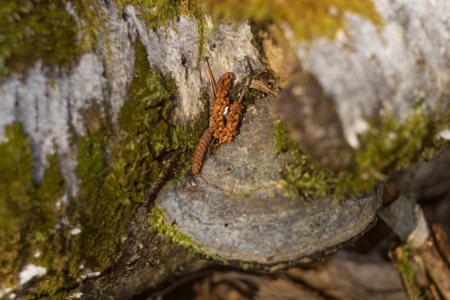 But I digress from the topic of macro photography. Walking through the woods, I came across an old birch trunk, which lay across the stream. It had a whole colony of polypores. Of course, I could not pass by.