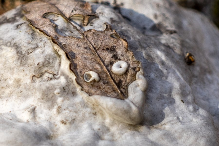 Этот трутовик оказался в маске и с глазами. Обратите внимание, так тело гриба повторили очертания прилипшего к нему листа рябины. Я такое видел в первый раз.