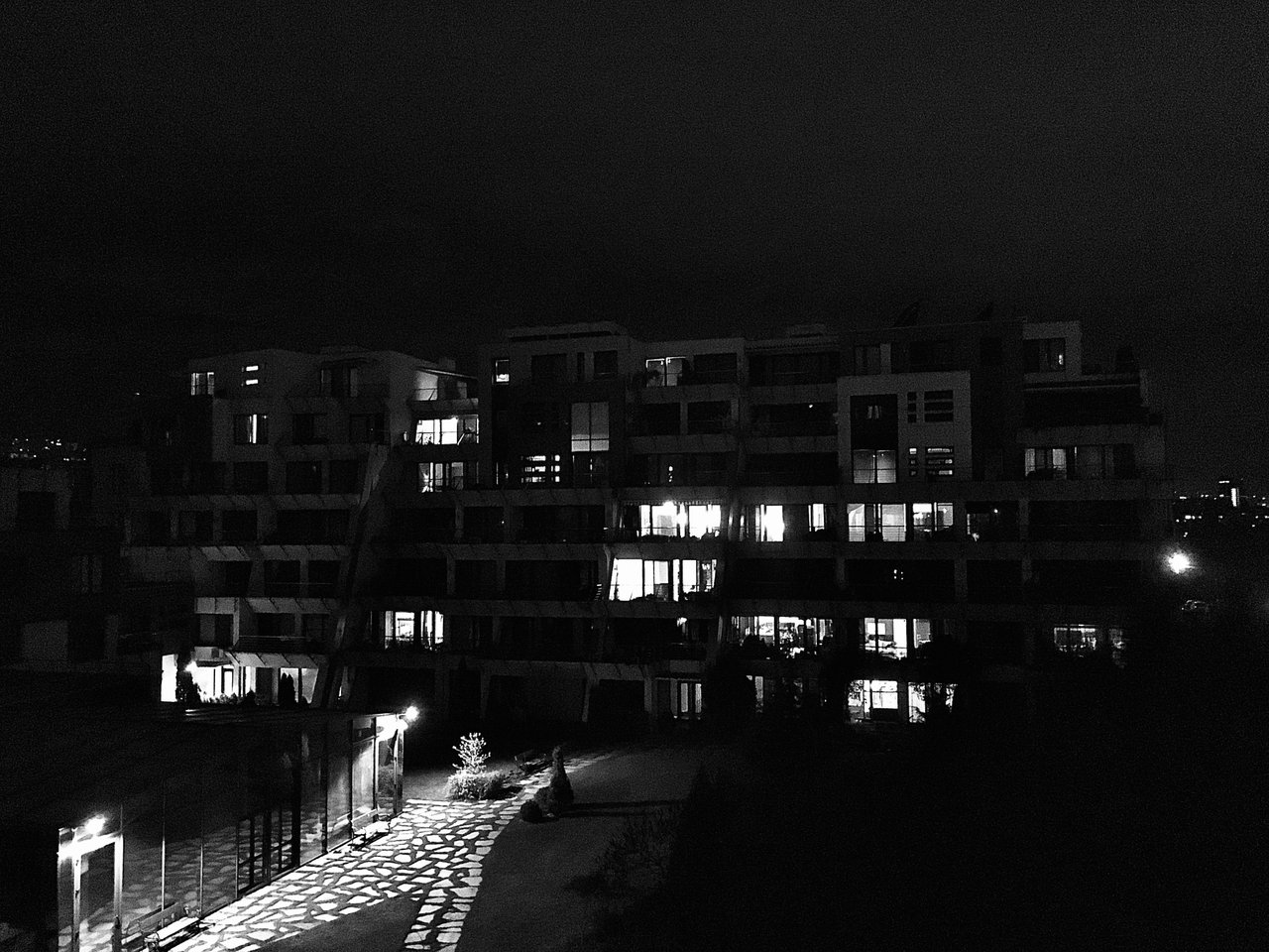 Greetings guys i hope y'all having a great time. I am excited to be a part of this week's contest and this time the idea is the most expandable one, because it revolves around the notion of darkness , a concept that is interpreted in diverse ways by each individual. To ease the process i took two identical shots from my apartment located in a private complex made during the hours of darkness. I decided to take this practicular photo, because the view is very eye-catching at night making a mesmerizing landscape. In order to amplify the theme and enhance the visual appeal, I have applied two distinct IOS filters to the images, rendering them in a more "Dark-ish" tone. The first one is called "Dramatic" making the photo more striking increasing the contrast and the saturation of the photo, resulting in deeper shadows. The second one is called "Mono" highlighting the textures giving the photo more vintage look and making it black and white.
