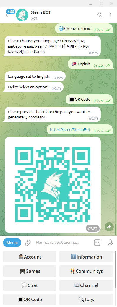 When you have selected the language in which the telegram bot will be displayed to you, you can see the 🔳QR Code button. Just click on it.