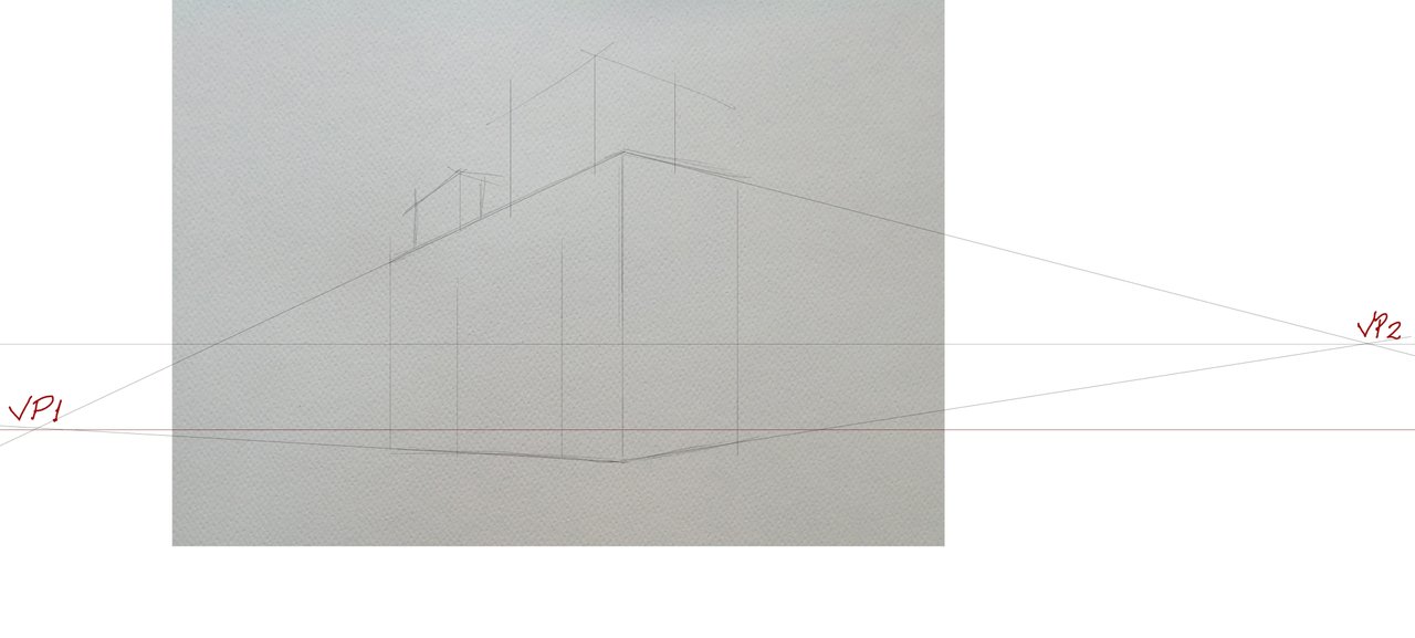 I have chosen the one of VP1 and I eliminate the other, keeping only the distance at which the vanishing lines intersect to define VP2 on the horizon line of VP1.