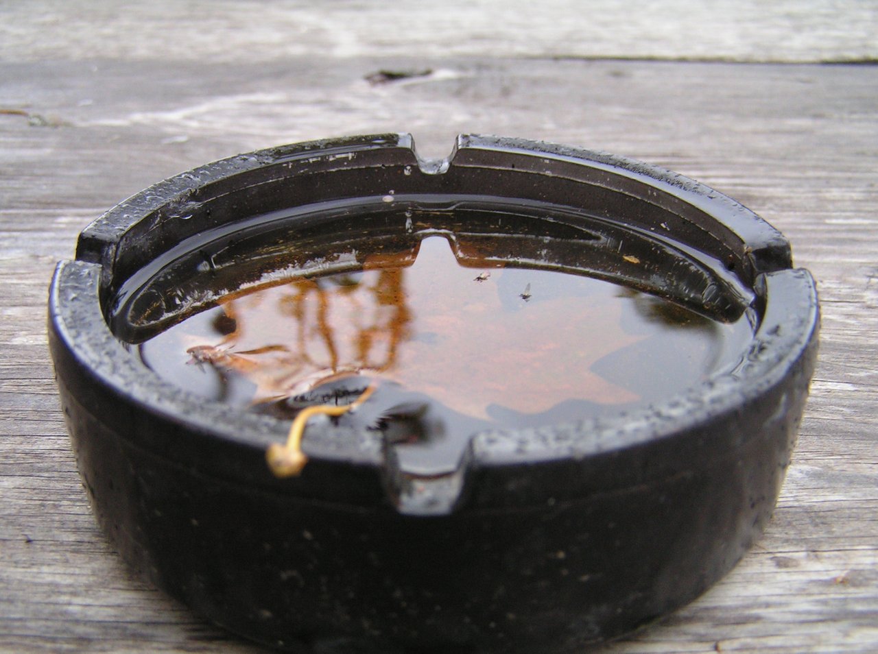 This morning I saw this maple leaf drowned in an ashtray filled with rainwater. The leaf is small, it fell from a maple tree that I planted and grew myself in my yard.