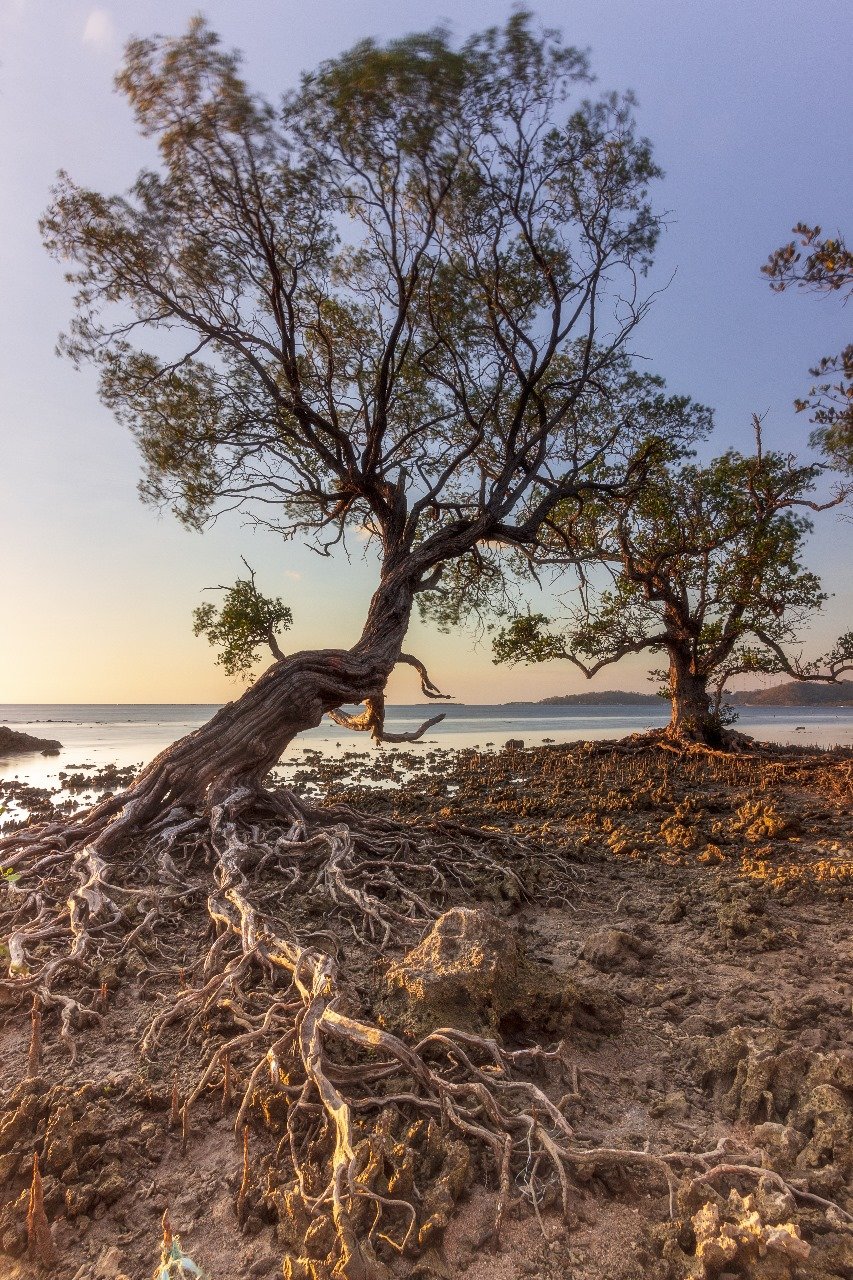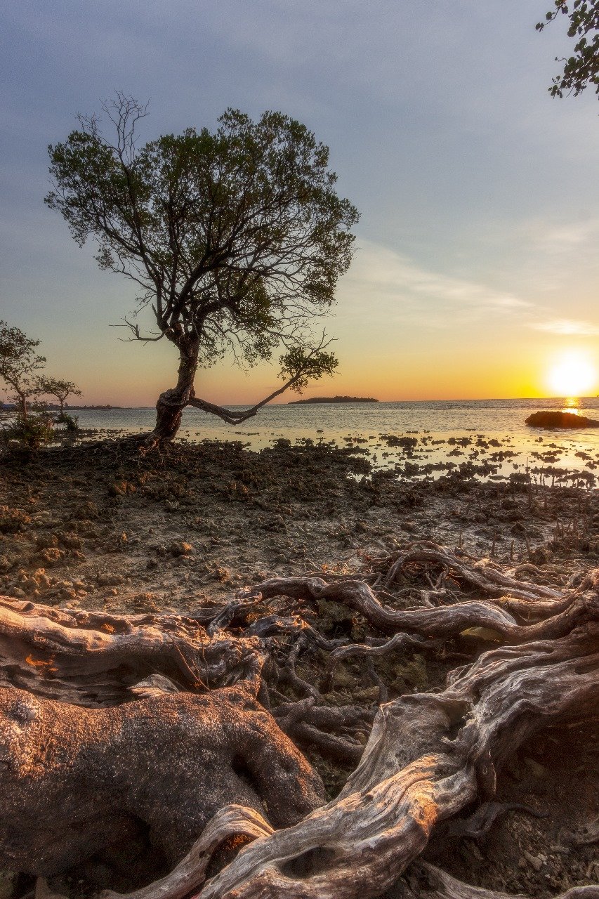 I stopped, looked around and was immediately excited because of the unique shape of the mangrove tree with its roots appearing on the surface. Luckily it was low tide, very good condition for taking photos at this location. I prepared my camera, tripod and filter. Start looking for a composition that is right. And this is the result of my photos that day.