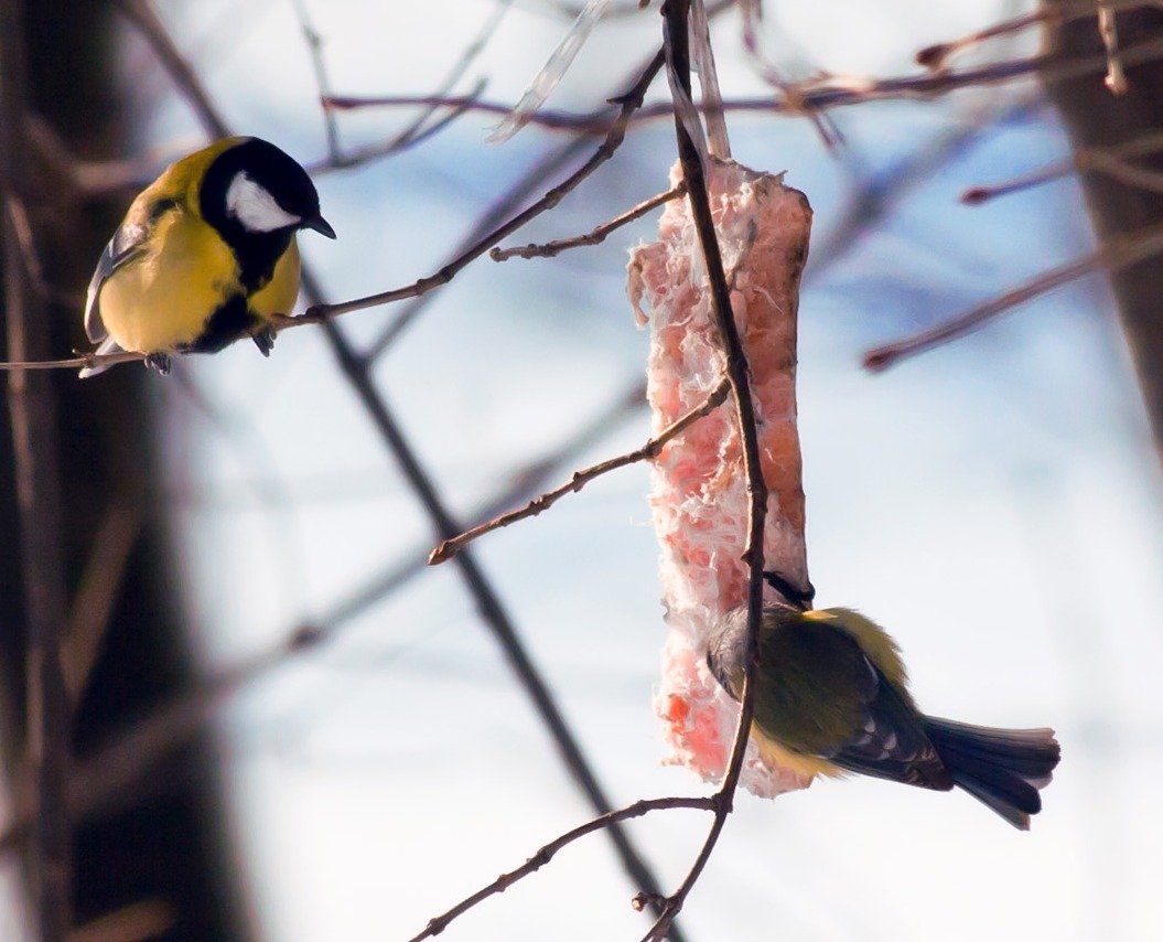 But the tits are another deal. They love to consume seeds too (sunflower seeds are their fave). But the most delicious and favourite food for them, is lard! And lard do not need any feeders to be implemented - a slice of lard, with the help of a rope, can be hanged at any spot, any branch you like!