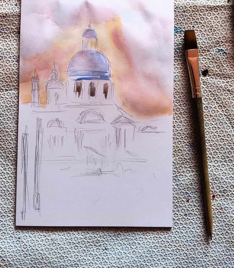 Yesterday I was trying my watercolour paints and I used the favourite motif it is Venice. I was there once everything was beautiful and we were lucky that the weather was warm I even can tell hot so that during the day we had to cool down in a Church. So this is a well know scene and it is quick sketch, of course the paper is not really watercolour paper that is why it is slightly wavy paper.
