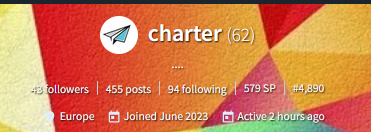 This user @charter is only 4 months on Steemit and from Spain and his posts are set up to 100% Power Up. He is active in many different communities and time to time takes part in different community activities, I came across when he was taking part in contests in WOX and CCS Communities.