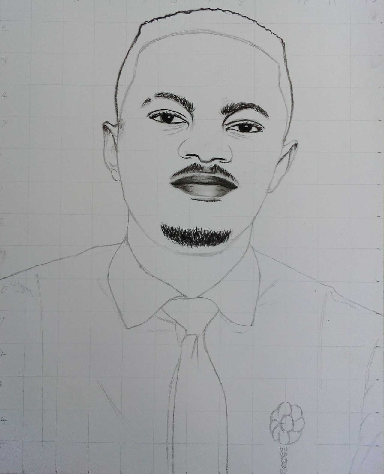 I drew my grid lines and made my sketch then started shading it gradually. Sometimes I usually start some of my portraits from the hair, but in his case I started with the nose eyes, down and lips. This is to helps me work downward and from left to right before moving down to the clothing. I do this to avoid smudging the part I may have already worked on. I really took my time to include everything in detail. Making sure nothing was left out since I want him to really appreciate a good work. And I know myself. I know I'm always committed to excellence regardless of who my client may be.