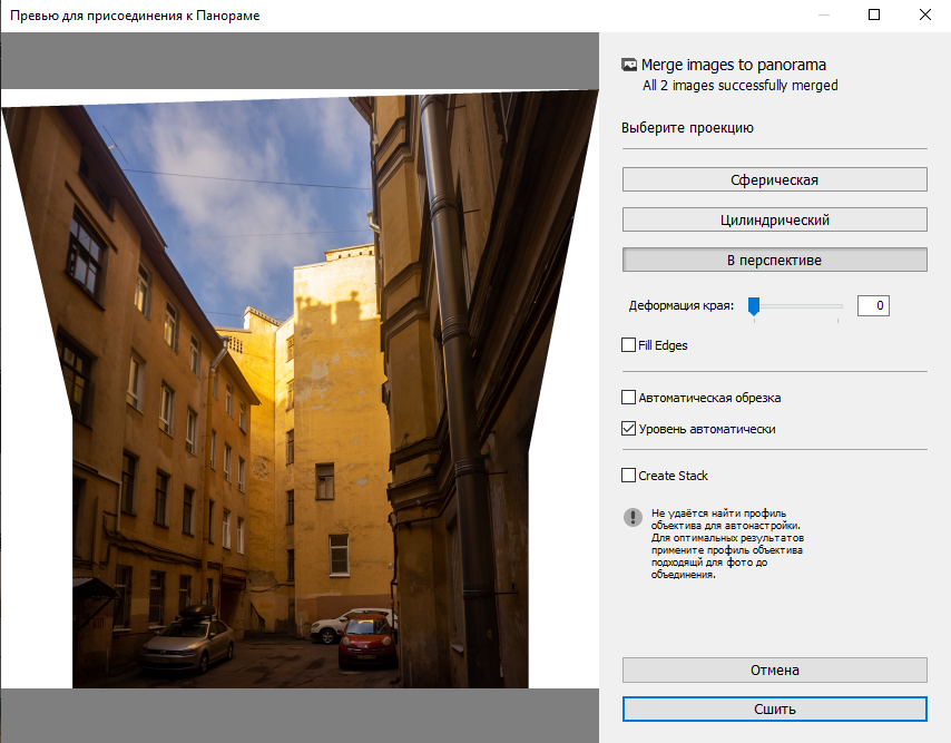 Now I will give an example of getting a panorama from two pictures without a tripod.
