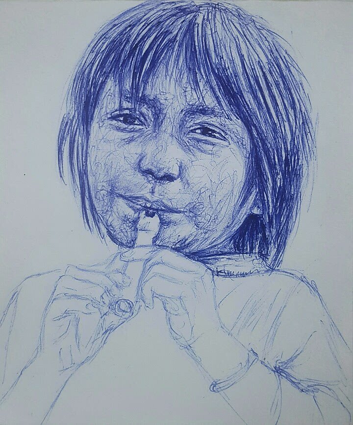 This drawing was done with a blue ballpoint pen on a cardboard paper uding scribble style. Check out my steps below: