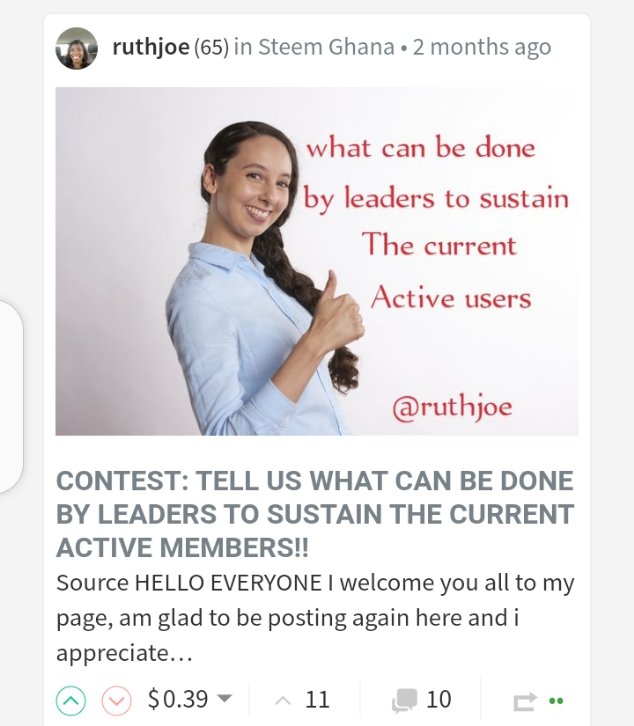 @ruthjoe with your first nomination, personally I was a part of that contest. Your points raised are pellucid. Leaders should learn to at least acknowledge every post made in the community. Very true at times, individuals who attempt contest do their very best to make contest interesting but they become fed up when their posts they spent some time to write don't get upvote.. Secondly, leaders should upvote post no matter how little the votes are. Truly these urge steemians on. Then also, leaders must educate members on #club5050 initiative and they must also check on members. I think leaders will visit the post again . You did great in that contest I must frankly commend you on that effort.