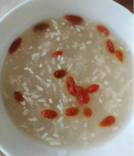 4、从冰箱冷藏室拿出米酒,待水烧开后用勺子舀出两大勺放入开水中,搅拌,撒入枸杞。拌好后,倒入藕粉快速搅拌均匀。