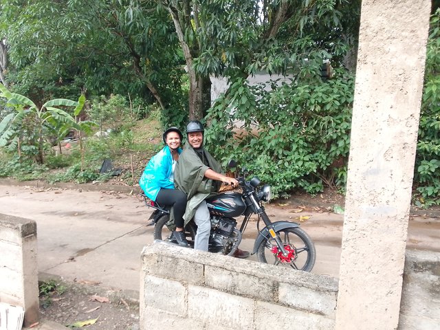 Como el clima está tan bipolar se había nublado bastante el cielo y habían caído unas gotas ellos vinieron preparados con sus impermeables para no mojarse,por sia,llovía más duro, pero fue falsa alarma de lluvia jeje claro! Yo aproveche y le tome foto, apenas llegaron. Nos tomamos un café y estuvimos hablando un buen rato. Mi esposo por cierto le presto una herramienta de trabajar albañilería.