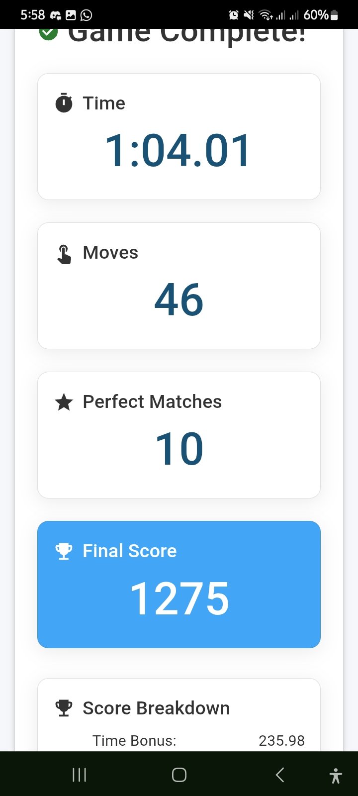 Entonces comencé la segunda partida. Es decir, el proceso de emparejamiento del segundo rompecabezas comenzó. Me tomó un minuto y dos segundos resolver el segundo rompecabezas y logré sumar 1307 puntos. Jugué un poco mejor en la segunda partida que en la primera y estoy muy contento.