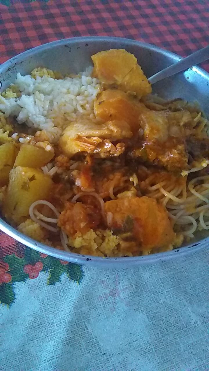 Para o almoço hoje eu fiz macarrão, arroz, feijão, frango cozido e jerimum, eu almocei era umas 11hs, depois falei com meus filhos, e fiquei um pouco na calçada do comércio do meu marido enquanto ele almoça lá mesmo, assistindo televisão, era umas 12hs eu fui dormir um pouco.