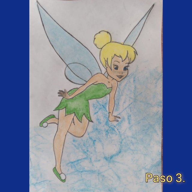 En el tercer paso se siguen utilizando las tizas de colores: con el color carne se colorea la piel de TinkerBell, mientras que con un azul de tonalidad mas oscura se realiza la base del fondo del dibujo: