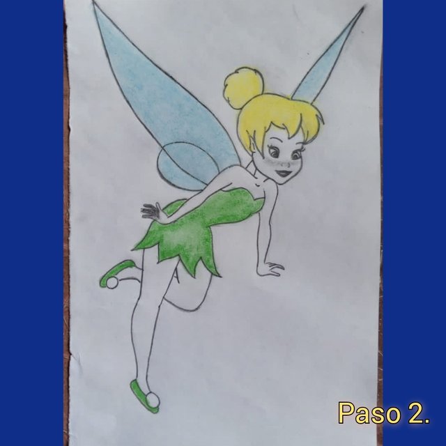 El segundo paso consiste en empezar a colorear a TinkerBell; a darle color mediante el uso de las tizas. Con la tiza amarilla coloreo el cabello, con la azul las alas, y con la tiza verde se le da color al vestido y a los zapatos; dando como resultado la siguiente imagen: