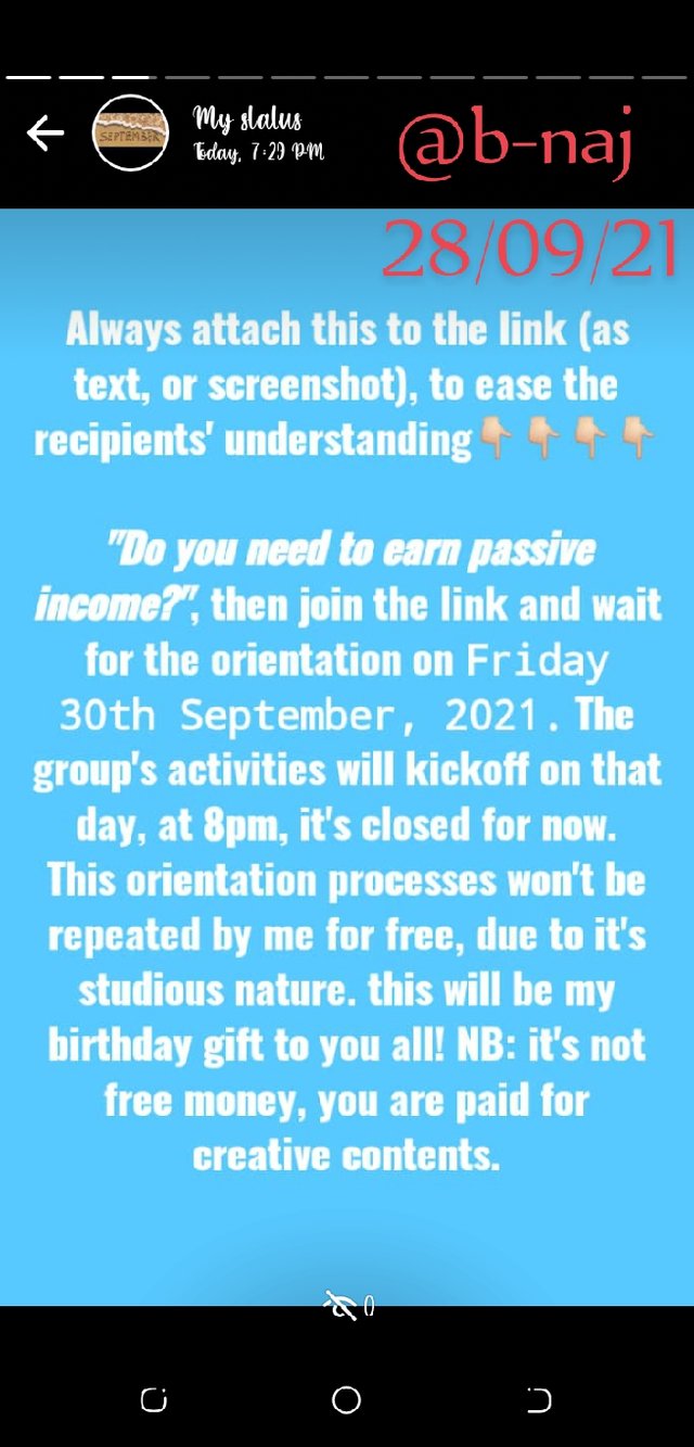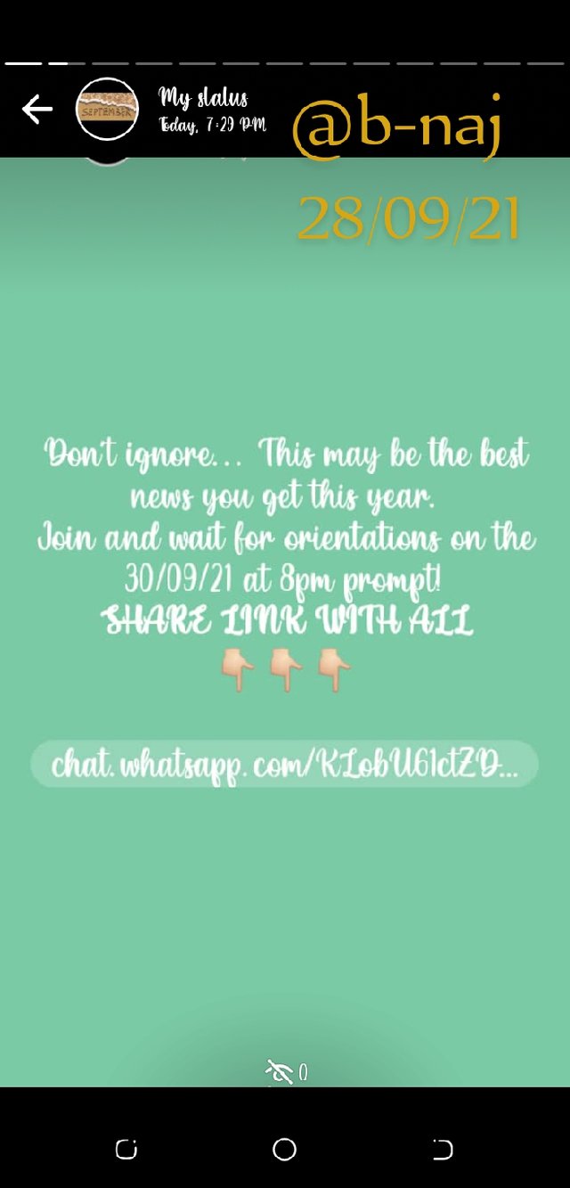 The 6th status upload was done immediately after i realised that my 1st status upload was a screenshot, and as such, needed a clickable link for easy execution. It was the link to the orientation group.