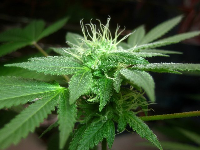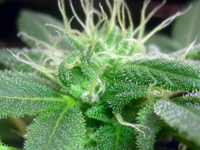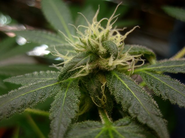 Closeup of MK Ultra flower. Very few pistils have darkened, and the bud looks fluffy (not dense). Lots of sparkly trichomes though, as I noted a few days ago. And they smell GREAT.