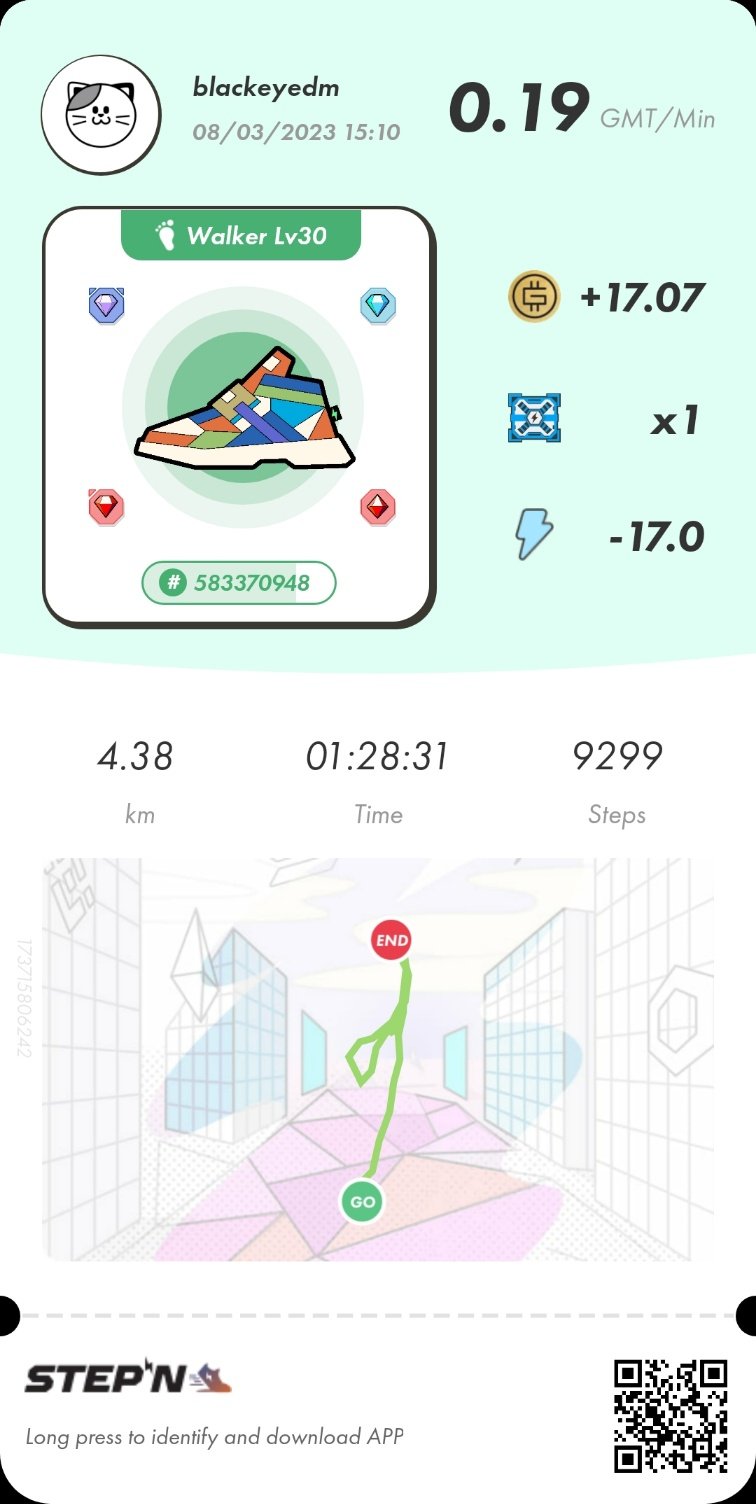스테픈 걷기 운동 일지) 23.03.08blackeyedm (86)in Korea • 한국 • KR • KO • 3 years ago (edited) 어제 17 GMT 획득과 5렙 미박에서는 1렙 컴포트 젬 3개와 2렙 에픽 젬이 나왔네요 Good~!! 그리고 총 1시간 28분 걸었습니다^^ 오늘도 시간 내서 걸어야죠ㅎㅎ 23.03.09-2 . #kr #zzan #stepn #stepnkr #m2e #aaa #dblog