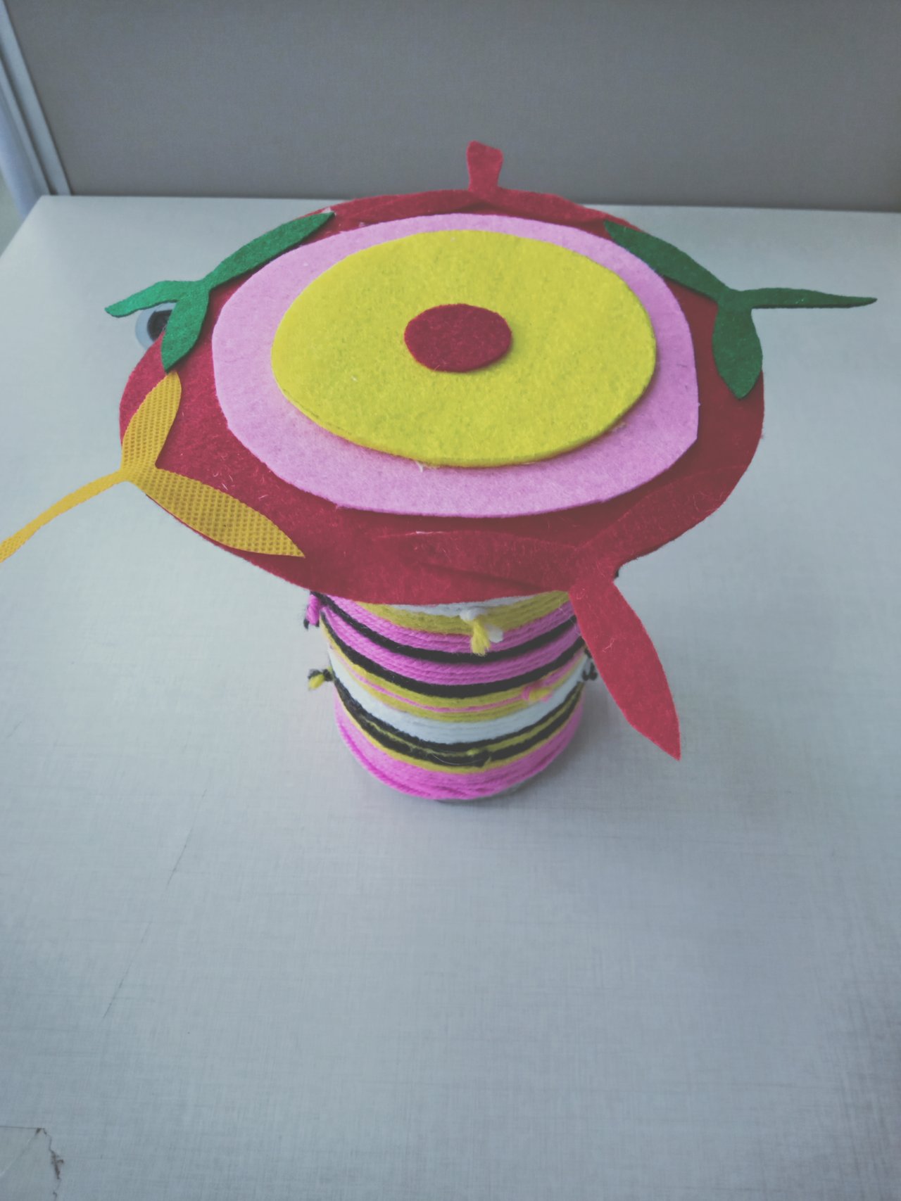10)I draw a triangle at the top of the last flower .Inserts red color and some cotton to make it look beautiful ,Later I put it on the top part of the flower