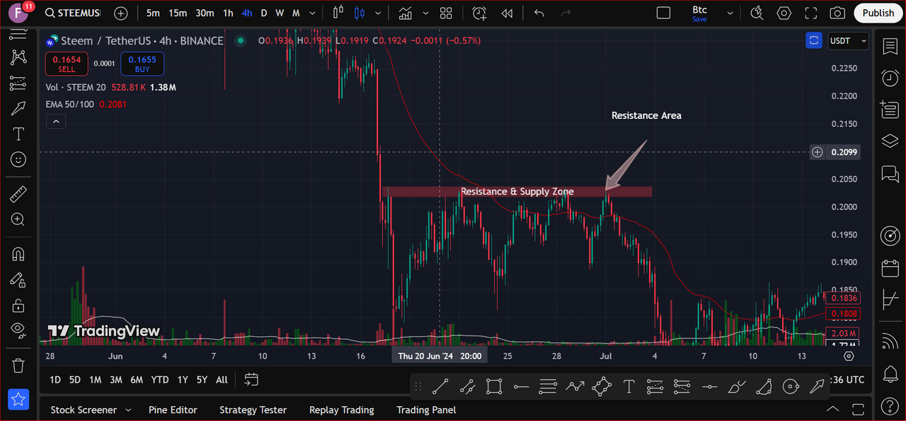 Above chart shows the price of STEEM/USDT with the 50-period Exponential Moving Average, in which the price face strong resistance and then brake below at the 50 EMA. This signals is a possible downtrend, meaning sellers are taking control to steem. After breaking the EMA, the price started falling, that is the confirm bearish momentum. We might see this signal as a selling opportunity, expecting with the lower prices. The resistance zone acted as barrier, preventing the further upward movement. This breakdown suggests the weakness in market and leading to a decline.