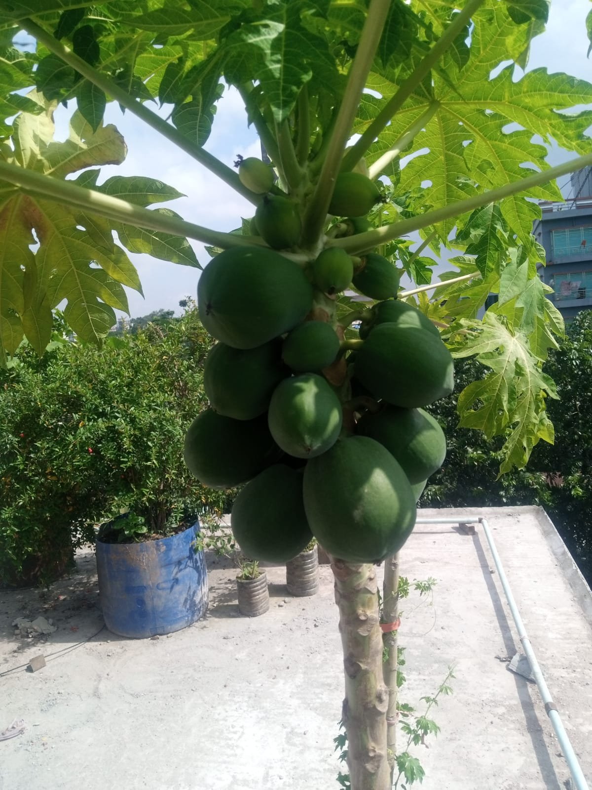 After I came to the roof, I checked all the trees there. The pumpkin tree is growing well. There are some flowers already. My father takes good care of that. He is already watering that. I didn’t have to do anything. I checked all the other trees there. Papaya grows well. We are waiting for ripping. It tastes very sweet. Or, the big one would already be eaten as vegetables. Haha. We love papaya. That’s why half of our trees are papaya trees.