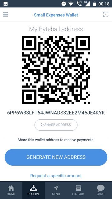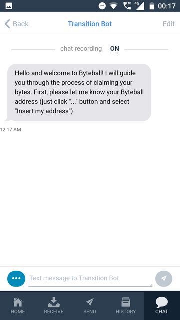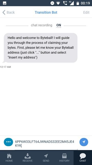 4.開啟BOT,BOT將要求輸入你的Byteball錢包地址;到「接收」即可查閱地址。