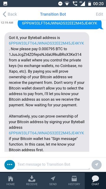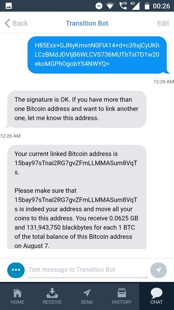 Type in the sign to BOT. Within seconds the BOT will reply that linkage is made and you can now send bitcoin to linked address. You only need to have coins in your address hours before the snapshot to join the distribution.