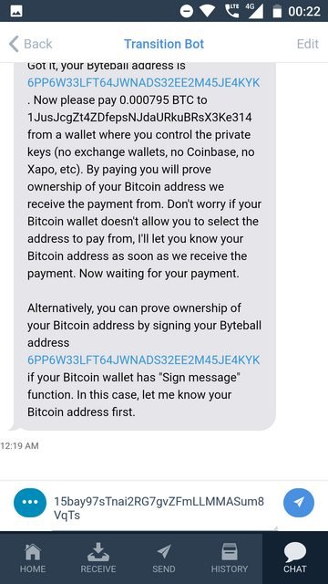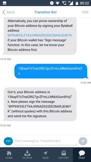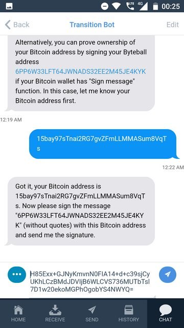 7.在BOT輸入簽名,BOT回應驗證地址成功,即可傳送比特幣到已登記的地址,參與Byteball派送。要參與下次派送,你只需把比特幣在8月8日2時截數前存至已登記的地址就可。