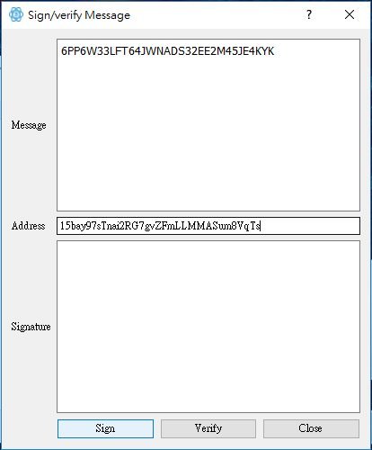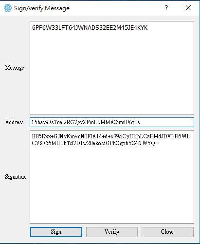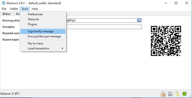 6.BOT會要求你簽名證明你是地址的主人。在Electrum選'Tools' > 'Sign/Verify messsage';在 'Message' 輸入Byteball地址、 'Address' 輸入比特幣錢包地址,按 'Sign' 得出簽名。