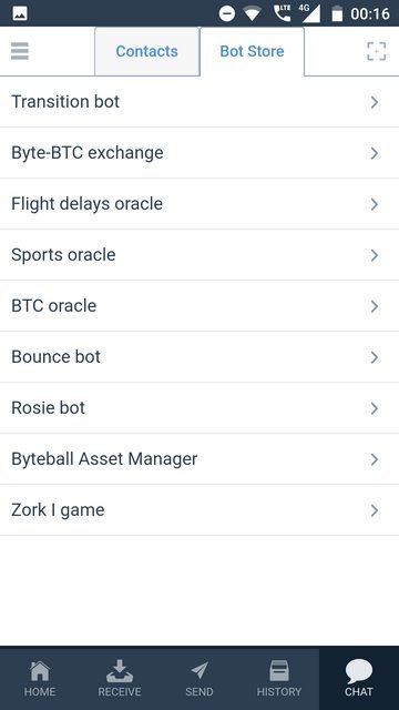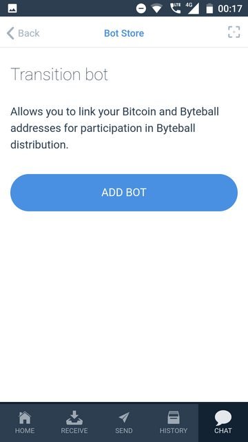 3.開啟Byteball錢包,選「對話」/ 'Chat'、'Bot Store'、'Transition Bot'、"Add BOT' 來開啟協助連結比特幣錢包地址的BOT。