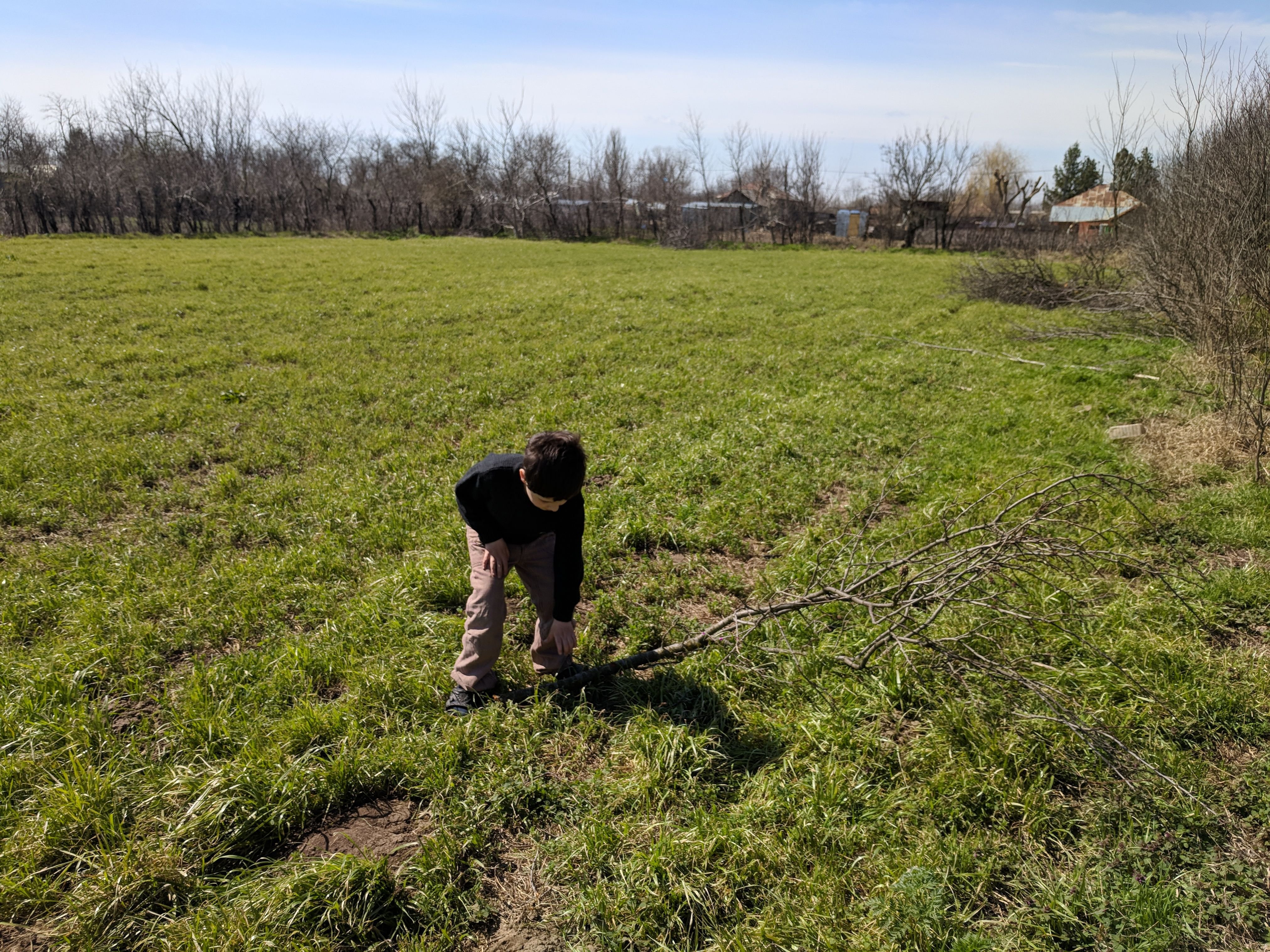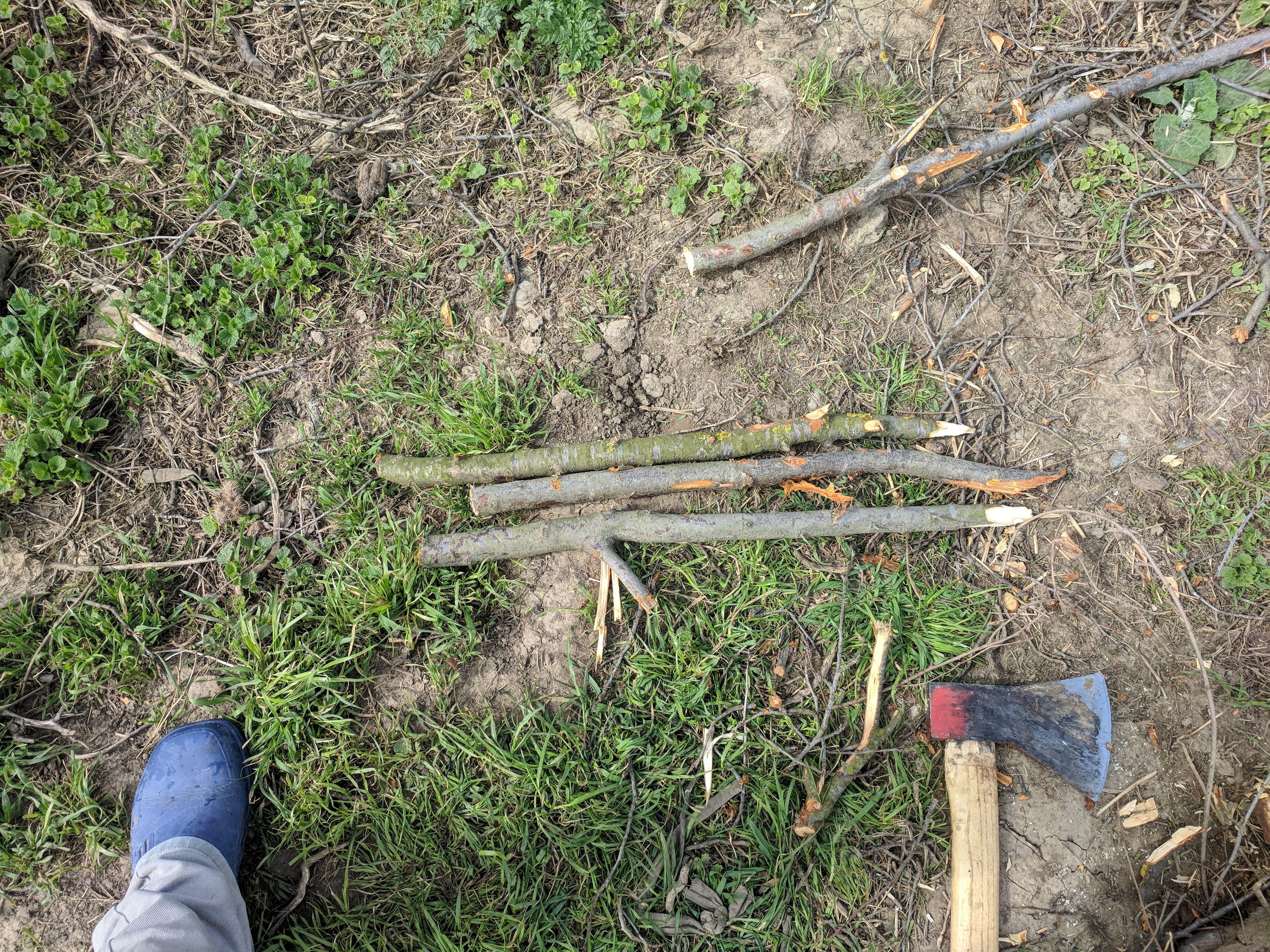 First, I needed some wooden stakes which I made from the bigger branches. My son helped me carrying them around :).