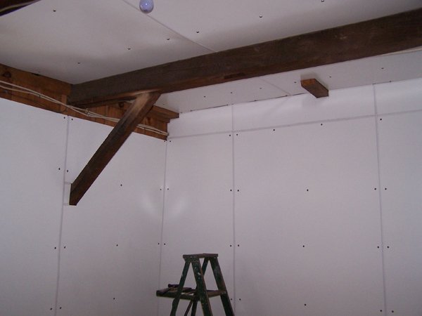 For the walls and ceiling we decided to try whiteboard as it was washable. We hoped it would fit tightly enough to be able to keep the room clean. But we had temporarily forgotten that the 150 year old tobacco shed was anything but square.