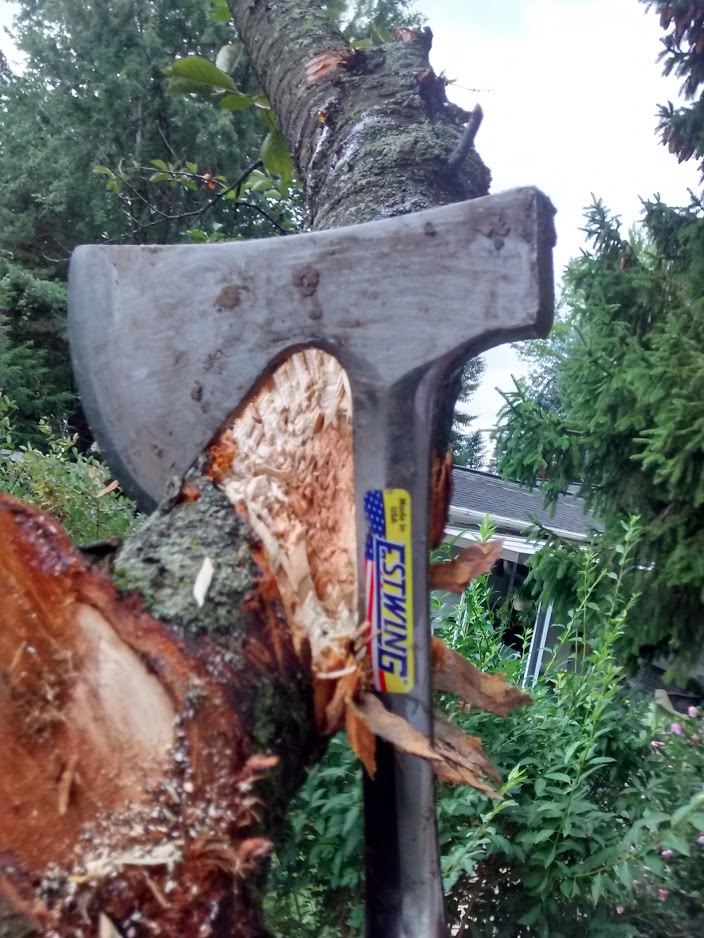 There was one big branch I wanted to get down today. Rather than grabbing the tree chain saw, I used my trusty hatchet. It was a hack job for sure.