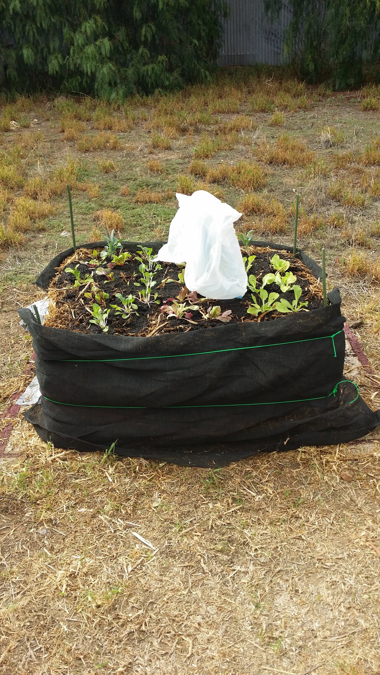I did a little reading online over a few days and discovered that there was a no dig, easy to maintain way to garden called 'Straw Bale Gardening'. The garden in the pic above is our first try. It has shade cloth around it to make it look tidy and slow down the rate at which birds stole the straw. That's also what the plastic bag is doing hanging from a stick. It was a rudimentary bird scarer...It seemed to do the job.