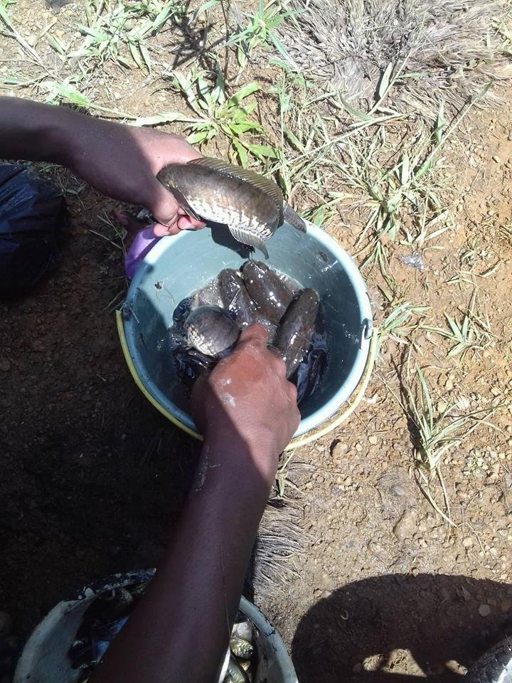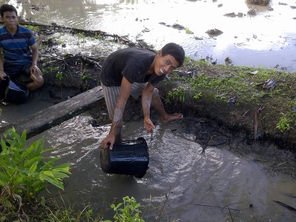 in my village there is still a traditional way to catch fish by draining the contents of ponds or ditches that will and predicted there may be fish