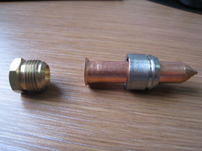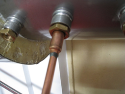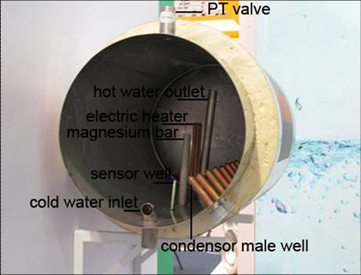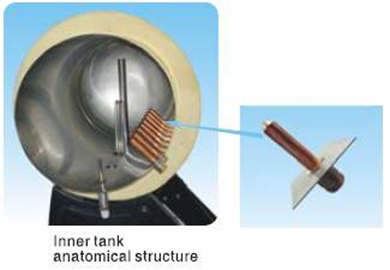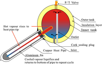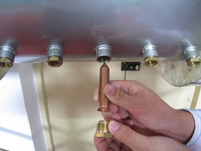 This copper tube is heated by the action of the Sun at very high temperatures. The tip of this copper tube is inserted in the water tank but without touching the water since the tank has screwed up some very thin copper caps in its structure (see pictures) where the cooper tube is inserted and this, in turn, heats the water that is contained into the thermal tank. This system is today the most efficient and safe. The water temperature also reaches 176 °F.
