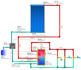 The simplest ones are made up of vacuum tubes through which the water passes. These are the most economical and are very efficient. The water temperature reaches 158 °F / 176 °F. The water enters the glass tubes, is heated and, by difference of temperature, the hot water rises and go into the collector tank. See Image 1