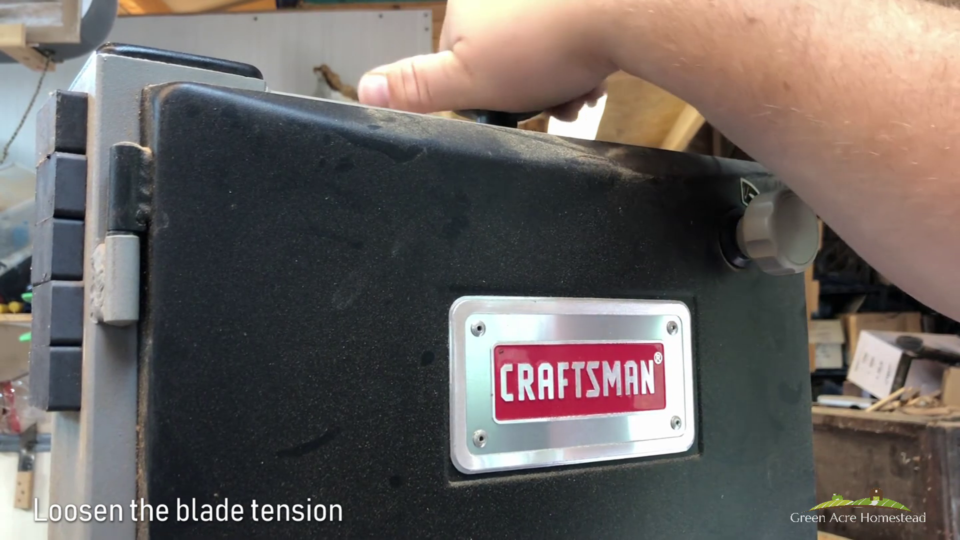 Loosen the blade tension by turning the knob on top counter-clockwise several rotations.