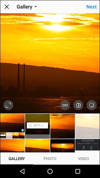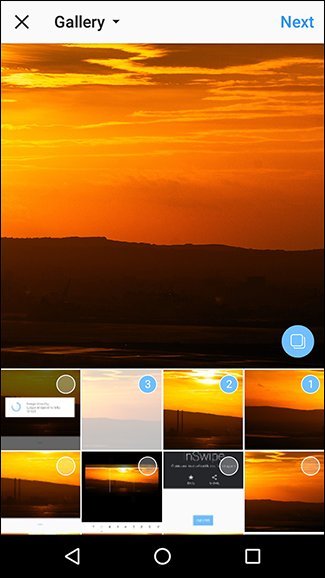 Posting the panorama is just like posting any group of photos to Instagram. Open Instagram, create a new a post, tap the album icon, and then select the images you want to upload. Make sure to select them in the right order so that the panorama works.