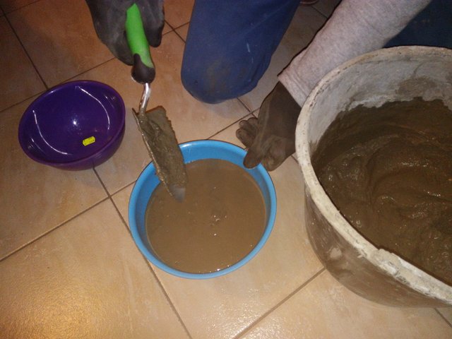 Put the cement in a bucket and add water. Mix it together until it becomes right (neither too soft nor too hard )