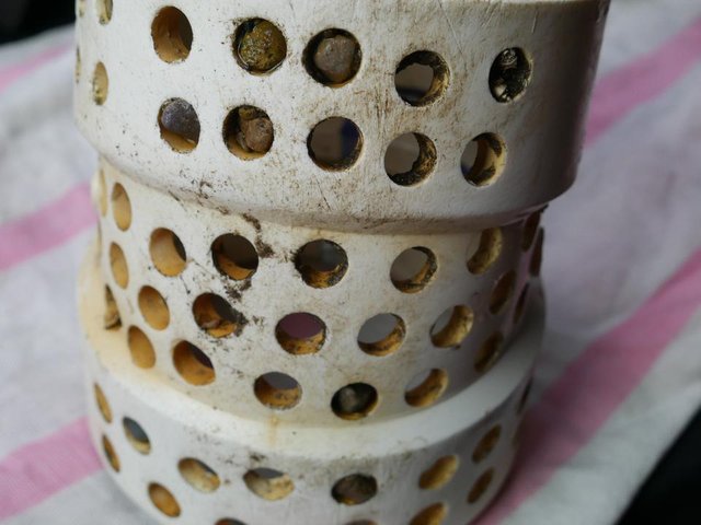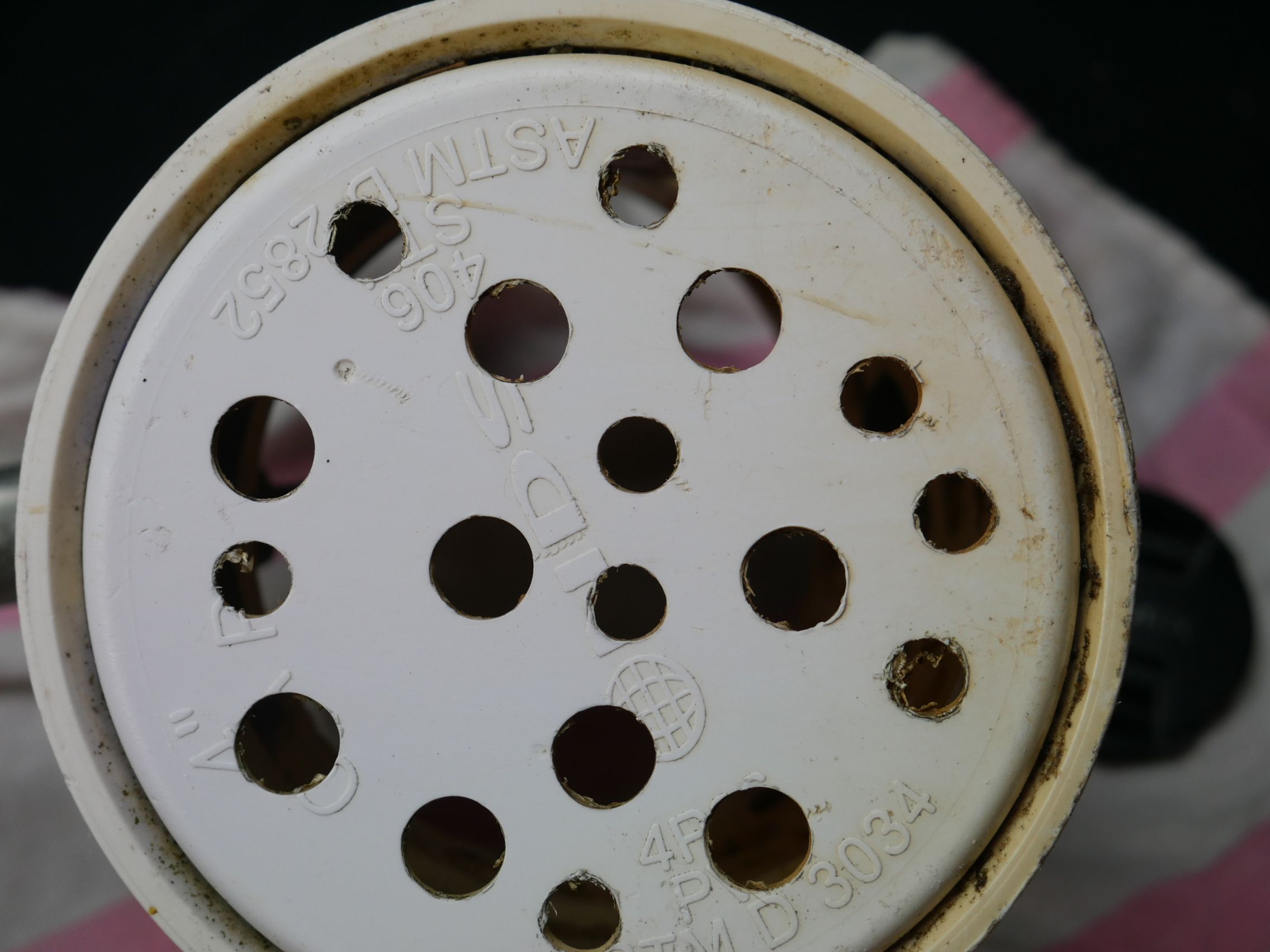 I used a 45 degree 4 inch PVC with a cap and drilled it out with a bunch of holes. You need them to be smaller than a dime, but big enough for some of the rocks to go out.