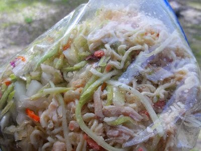 After the noodles were soft, mixed 'em in two quart-size, Ziplock-type bags with chopped onion, the slaw veggies, and the canned chicken. Two delicious meals!