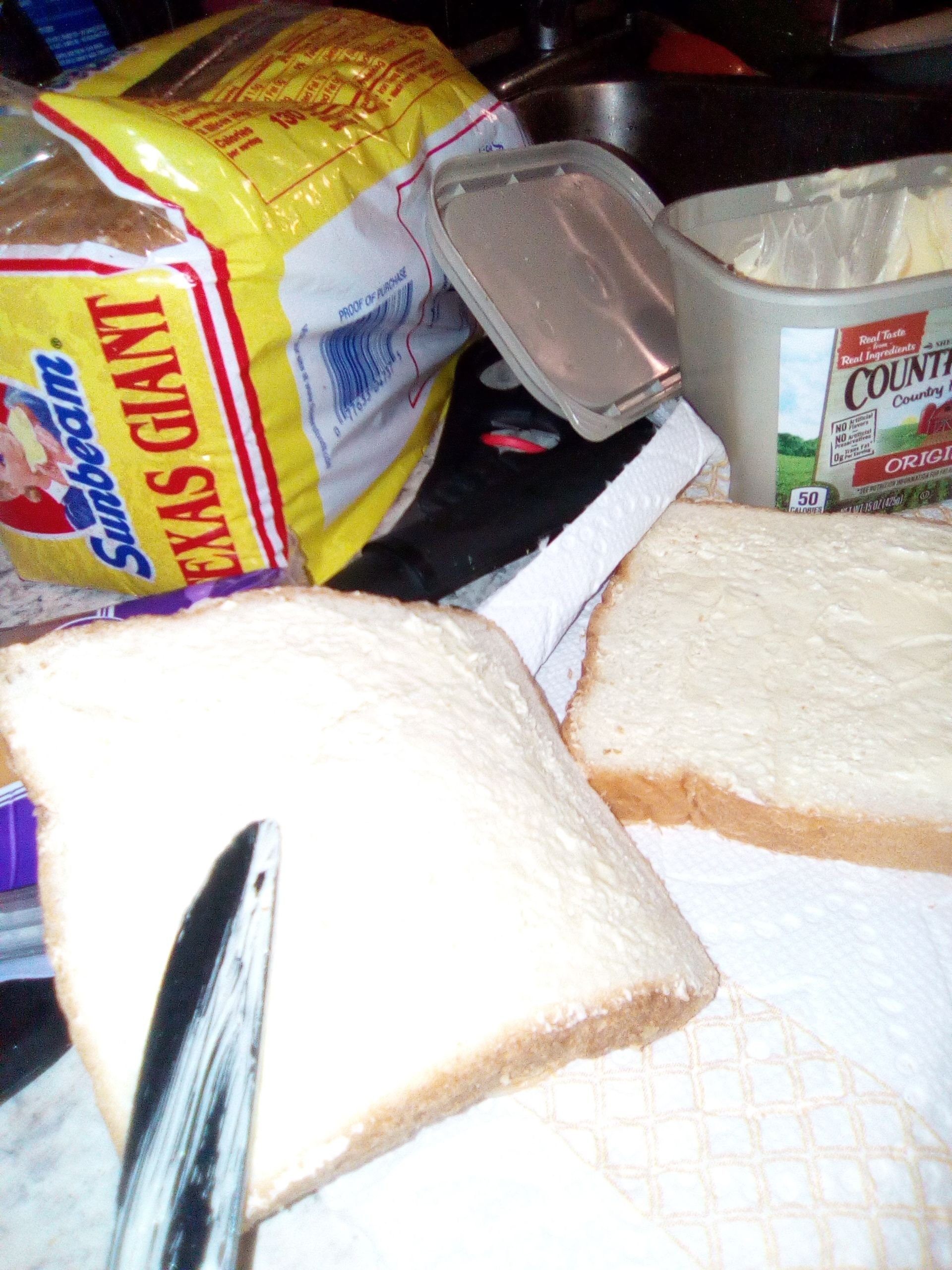 First step, I chose 2 of the best pieces of sliced whitebread I could find in the loaf that I had. In reality, any two slices of bread will work so you may go crazy with this part. You can choose from rye bread, sourdough bread, wheat bread, garlic bread, whole grain bread and so on!