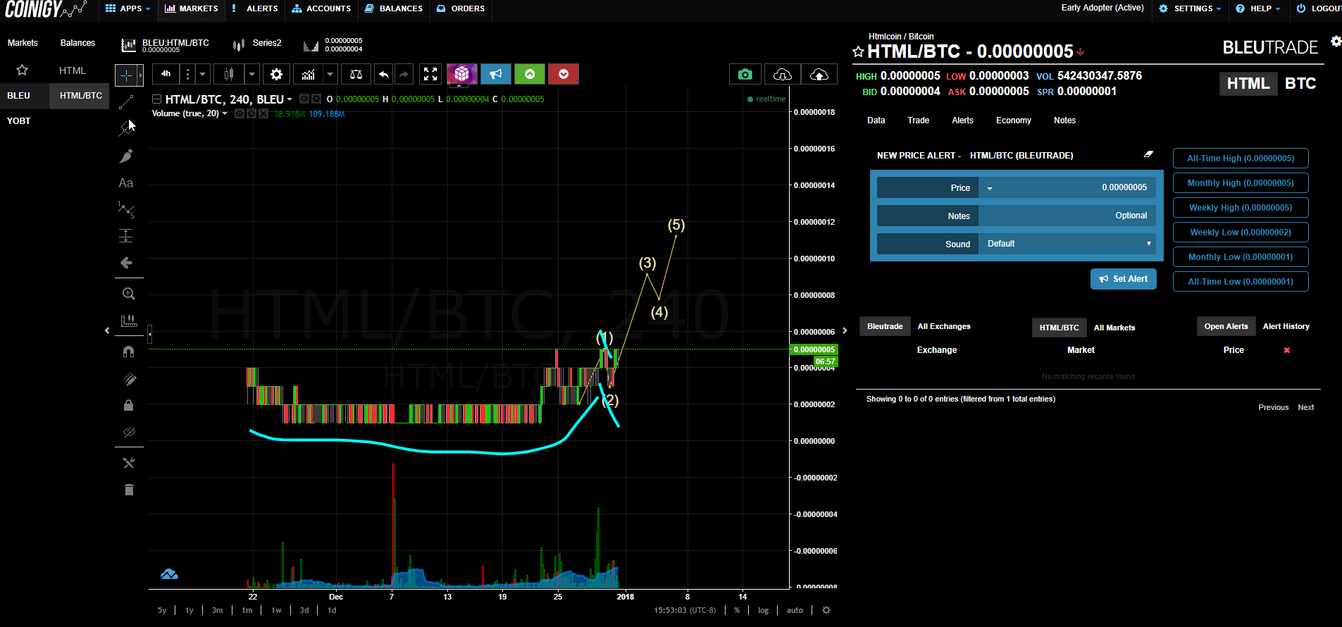 Everyone talks about new and upcoming alt coins and how you can make big money by buying when they first hit the market. I decided to pick one that had a low cost to get into. What I found was HTMLCoin. Currently it is selling for 5 satoshi. I anticipate it doubling to 11 or 12 satoshi within a week. No way I would say bet the farm on it but doubling your money is hard to pass up. I've never charted out a coin with such low volume before but as you can see in the chart a nice bull cup and handle formed and the coin is starting it's second wave. If I bought it at 5 satoshi I would set my sell line at 10. It's only being traded on a few markets so it might be more of a PITA to try to buy then it's worth dealing with. There are lots more deals starting or about to start so stay tuned!!